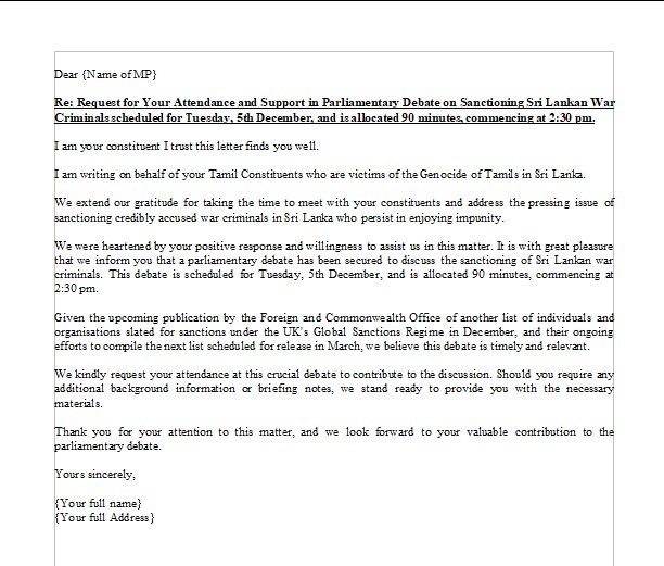 பாராளுமன்ற உறுப்பினர்களுக்கு அனுப்புவதற்கான மாதிரி கடிதம் ஒன்றையும் வெளியிட்டுள்ளது. அனைவரும் தயவுசெய்து அவசரமாக இந்த கடிதத்தை அல்லது இதுபோன்ற கடிதம் ஒன்றை அவரவர் பகுதி பாராளுமன்ற உறுப்பினர்களுக்கு அனுப்பி உதவுமாறு வேண்டிக்கொள்ளப்படுகின்றனர்.