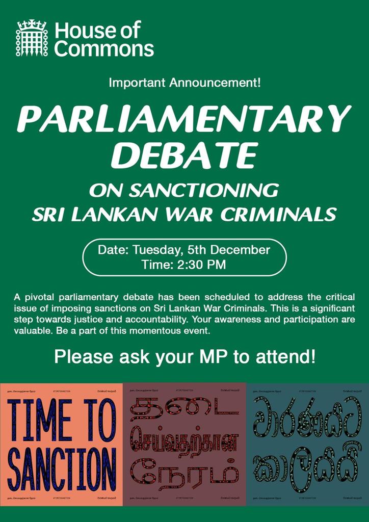 இனப்படுகொலைக்கு காரணமான இலங்கைப் போர்க்குற்றவாளிகளை பிரித்தானியா தடை செய்வது பற்றி கலந்துரையாட பிரித்தானிய பாராளுமன்றில் விவாதம் ஒன்று ஏற்பாடு செய்யப்பட்டுள்ளது. இது எதிர்வரும் செவ்வாய் அன்று (05 Dec 2023) மாலை 2.30 மணிமுதல் 90 நிமிடங்களுக்கு பாராளுமன்றின் வெஸ்ட் மினிட்டர் அரங்கத்தில் (Westminster Hall) நடைபெறவுள்ளது.
