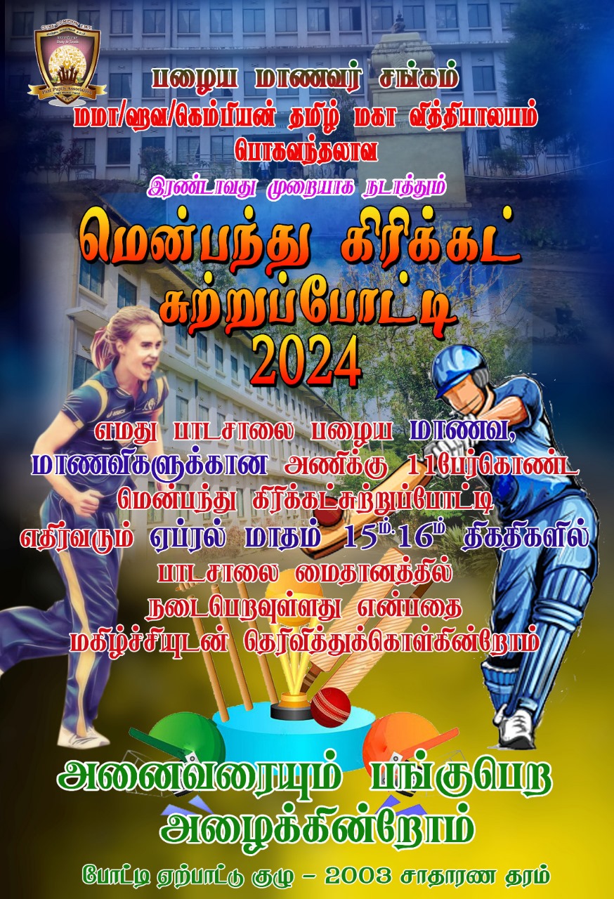 இந்த மென்பந்து கிரிக்கெட் சுற்றுப்போட்டியில் அனைவரையும் கலந்துகொள்ளமாறு போட்டி ஏற்பாட்டுக் குழுவினர் (2003 சாதாரண தர மா மாணவர்கள்) கேட்டுக்கொள்கின்றனர்.