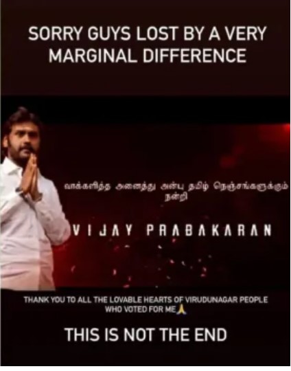 அவரை எதிர்த்து போட்டியிட்ட தேமுதிக வேட்பாளர் விஜயபிரபாகரன் 3,80,877 வாக்குகள் பெற்றிருந்தார். இதன் மூலம் குறைந்த வாக்குகள் வித்யாசத்தில் தோல்வியை தழுவி இருந்தார். இந்த தோல்விக்கு பிறகு விஜய் பிரபாகரன் அவரது இன்ஸ்டா பக்கத்தில் ஸ்டோரி ஒன்றை பதிவிட்டிருந்தார்.