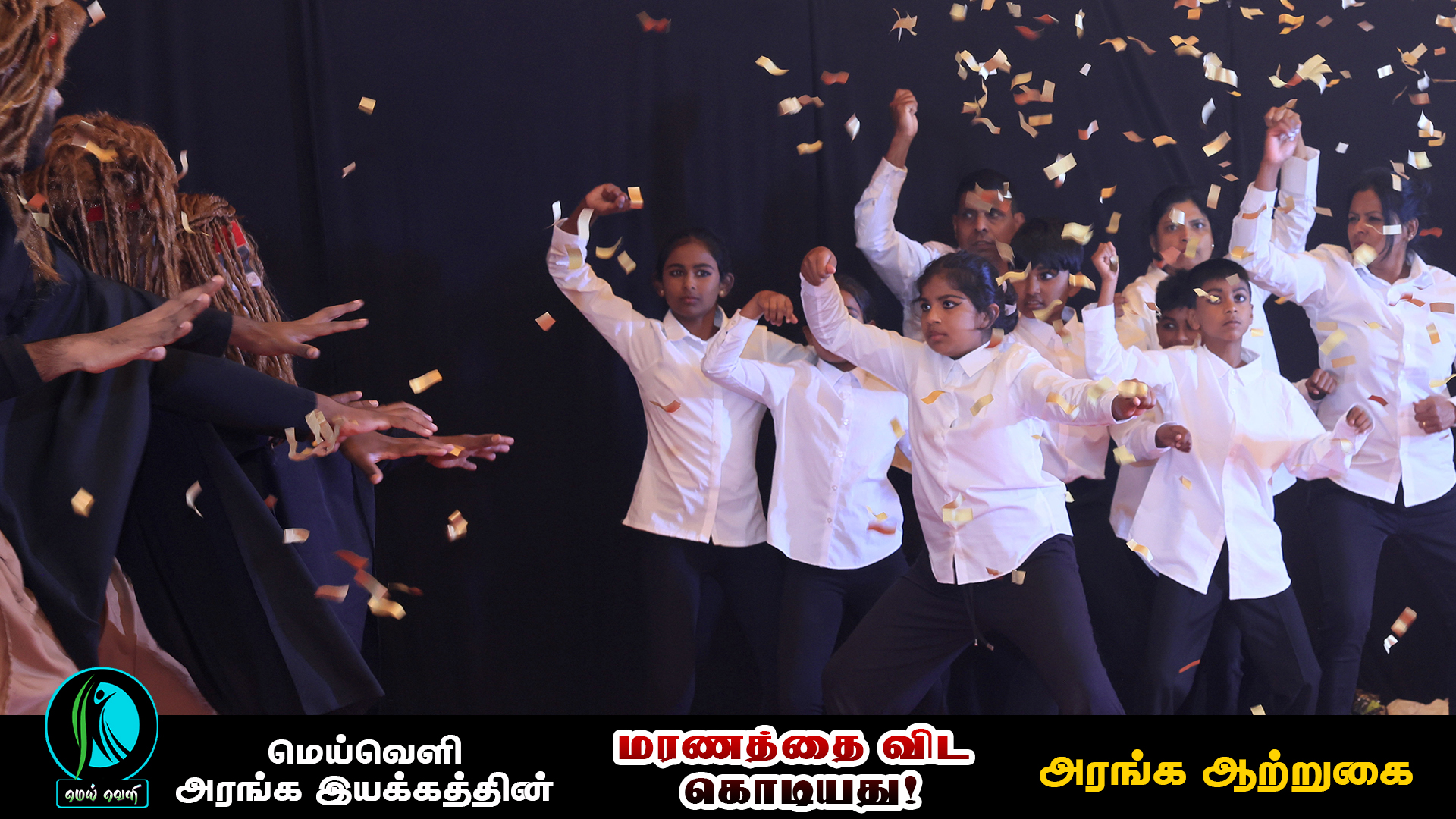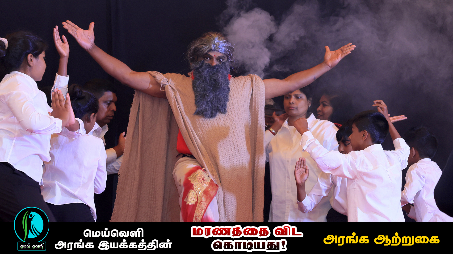மண் சுமந்த மேனியர், பொங்கு தமிழுக்குப் பிறகு மக்களை எழுச்சி கொள்ள வைத்த ஒரு நாடக முயற்சியை அன்று தான் நான் பார்த்தேன். உறைந்து போய் வியந்து உட்கார்ந்திருந்த என்னையும் மற்றவர்களையும் எழுந்து நின்று கைகளைத் தட்ட வைத்திருந்தது மரணத்தை விடக் கொடியது என்ற அந்த நாடகம். ஆரம்பம் முதல் முடிவு வரை கண்வெட்டாமல் மேடையோடு ஒட்டவைக்க நாடகங்களாலும் முடியுமா என்ற கேள்விக்கு மெய்வெளி அரங்க இயக்கம் சொற்களால் அல்ல தமது நாடக மேடையேற்றத்தால் பதில் சொல்லியிருந்தது.