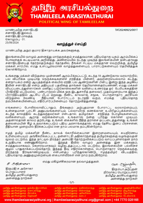 இலங்கையின் புதிய ஜனாதிபதியாகப் பதவியேற்றுள்ள மாண்புமிகு அநுரகுமார திசாநாயக்க அவர்களுக்கு, வாழ்த்துச் செய்தி அனுப்பிய தமிழீழ அரசியல்துறை