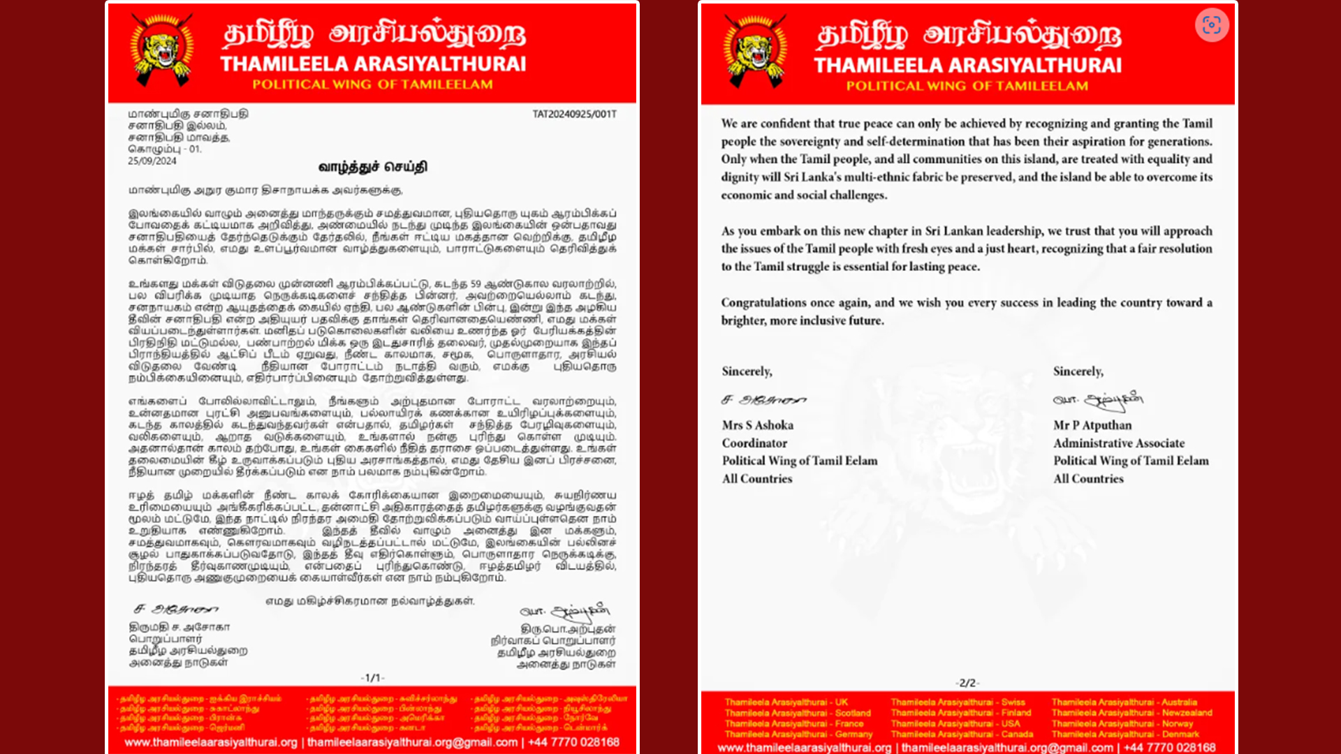 On behalf of the people of Tamil Eelam, we extend our heartfelt congratulations and deep appreciation for your overwhelming victory in Sri Lanka’s Ninth Presidential Election. Running on a platform that promised a new era of equality for all, your victory marks a pivotal moment in the nation’s history.