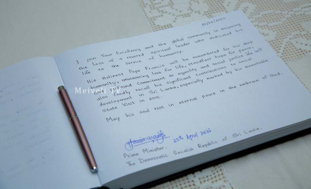 இதன்போது இரங்கல் புத்தகத்தில் கையொப்பமிட்டு, கத்தோலிக்க சமூகத்தின் ஆன்மீகத் தலைவரான திருத்தந்தையின் மறைவுக்கு இரங்கல் தெரிவித்த பிரதமர், இலங்கையிலும் உலகெங்கிலும் உள்ள கத்தோலிக்க சமூகத்திற்கு தனது ஆழ்ந்த அனுதாபங்களைத் தெரிவித்தார்.