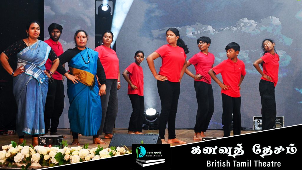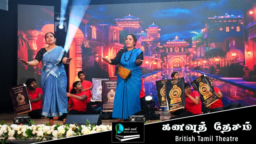 “இது எங்கள் சனம் சேர்ந்து இசைக்கின்ற பாடல்” என்றபடி அடிக்கடி மேடையில் வருவதும் போவதுமாக இருந்த இரண்டு பெண் நடிகர்கள் அவ்வப்போது வந்து எங்களுடன் கதைத்துவிட்டுப் போவது போல இருந்தது. மேடையில் நடக்கும் காட்சியையும் எம்மையும் கோர்த்துவிட்டுப் போகும் வேலையை அவர்கள் செய்தார்கள். வெளிநாடுகளில் இருந்து தாயகம் போய்வரும் இரண்டு தரப்பட்ட பேர்வழிகளையும் மேடையில் ஒன்றாக நிறுத்தி உரையாட வைத்ததன் மூலம் ஒரு சமநிலையை எமக்குள் தந்து நாம் இதில் யார் என்ற ஒரு சிந்தனையை எமக்குள் ஏற்படுத்தியது நாடகம். படித்ததாலோ படிக்காதுவிட்டாலோ உழைத்தாலோ உழைக்காத சொம்பேறிகளாக இருந்தாலோ அறிவு இருந்தாலோ இல்லையோ கெட்டித்தனம் இருந்தாலோ இல்லையோ வெளிநாடு வந்துவிட்டால் வாழ்வு நல்லா வந்திடும் என்ற ஊர்க்காரரின் பிழையான எண்ணத்தை தகர்க்க நாடகம் முனைந்திருக்கிறது என்று புரிந்தது.