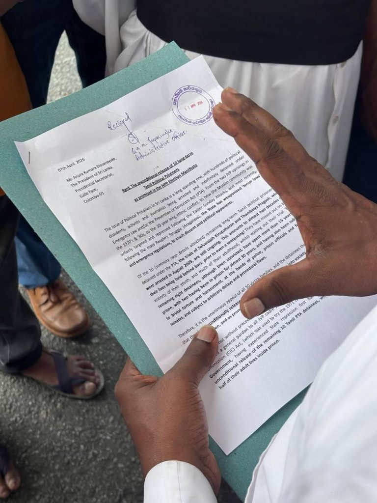 இலங்கையின் முன்னணி மனித உரிமை ஆர்வலர்களான அருட்தந்தை மாரிமுத்து சத்திவேல் மற்றும் அருட்தந்தை ஜீவந்த பீரிஸ் உள்ளிட்ட சிவில் செயற்பாட்டாளர்களது குழுவொன்று, “தேசிய மக்கள் சக்தியின் தேர்தல் அறிக்கையில் வாக்குறுதியளிக்கப்பட்டமைக்கு அமைய நீண்டகாலமாக தடுத்து வைக்கப்பட்டுள்ள 10 தமிழ் அரசியல் கைதிகளை நிபந்தனையின்றி விடுதலை செய்தல் தொடர்பாக” எனும் தலைப்பிலான மனுவொன்றை ஜனாதிபதி செயலகத்தில் கையளித்து, ஜனாதிபதிக்கு அவ்வாக்குறுதியை நினைவூட்டியுள்ளது.